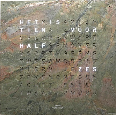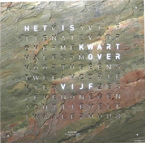 Weergave in verlichte woorden d.m.v. L.E.D. verlichting. De tijd wordt met een interval van 5 minuten op het display veranderd, de tussenliggende minuten worden door de brandende punten op de hoeken weergegeven.Lichtsensor past de lichtintensiteit aan op basis van het beschikbare licht van de omgeving.