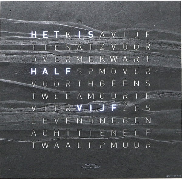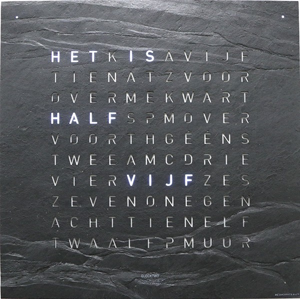 Weergave in verlichte woorden d.m.v. L.E.D. verlichting. De tijd wordt met een interval van 5 minuten op het display veranderd, de tussenliggende minuten worden door de brandende punten op de hoeken weergegeven.Lichtsensor past de lichtintensiteit aan op basis van het beschikbare licht van de omgeving.