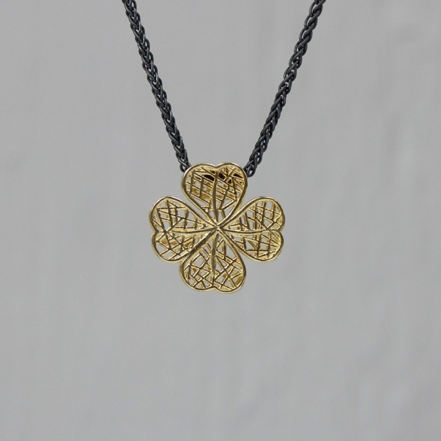 3D print 14krt gouden klaver4 hanger met zwart zilveren collier 20538 uit de Black Beauty serie van Jéh.