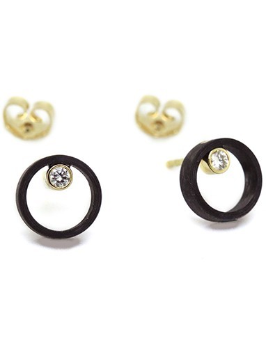 Carbon oorstekers met biljant 2 x 0,06crt TW/Si, gezet in 18 krt goud en stekers met pushoir van 18krt goud.