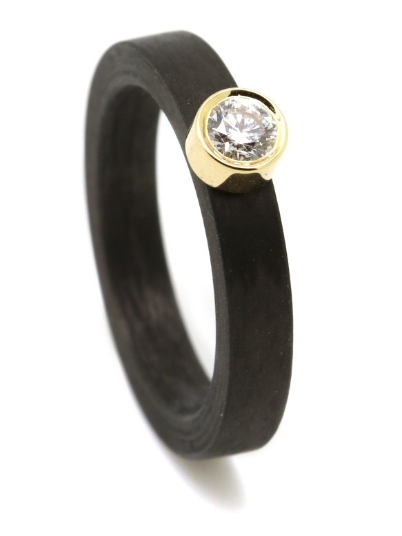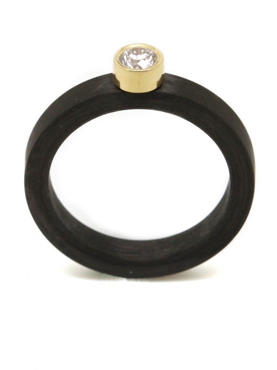 Carbon ring met biljant 0,21crt TW/Si, gezet in 18 krt goud. Ring is 3,5 mm breed.