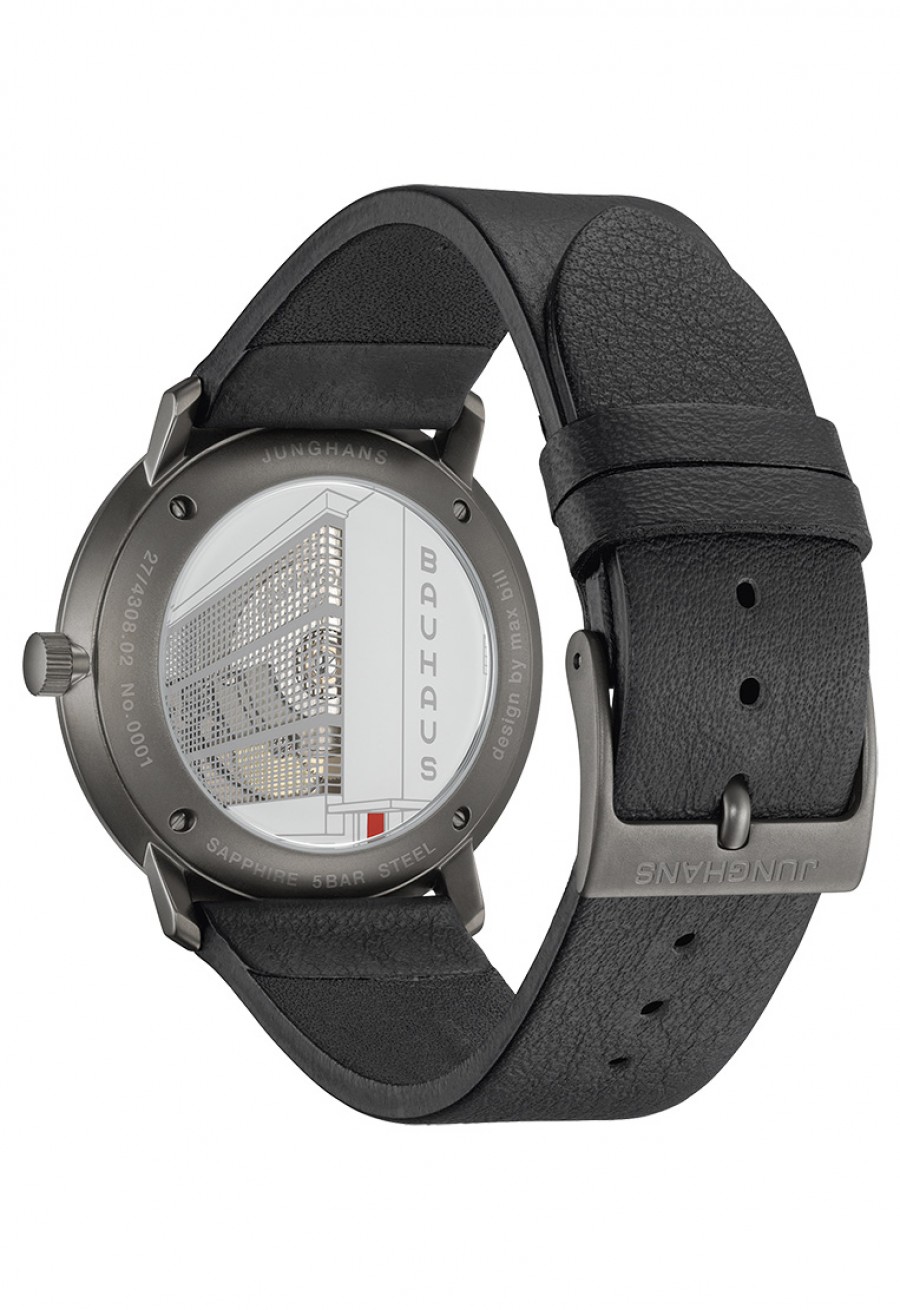 Minimalistisch design met rode accenten: De Bauhaus-modellen uit de max bill-lijn verwijzen naar de rode deuren van het Bauhaus-gebouw – een detail dat Max Bill meteen opviel bij zijn eerste bezoek aan Dessau. Door de ramen van een Bauhaus-afbeelding op de onderkant van de behuizing kun je zien hoe het mechanische werk van binnenuit functioneert.