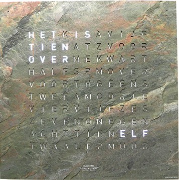 Weergave in verlichte woorden d.m.v. L.E.D. verlichting. De tijd wordt met een interval van 5 minuten op het display veranderd, de tussenliggende minuten worden door de brandende punten op de hoeken weergegeven.Lichtsensor past de lichtintensiteit aan op basis van het beschikbare licht van de omgeving.