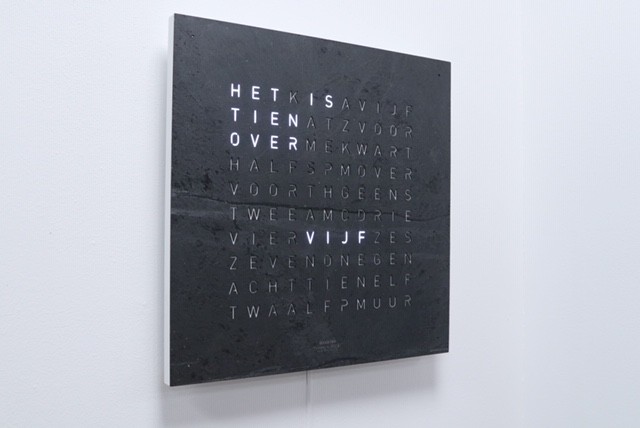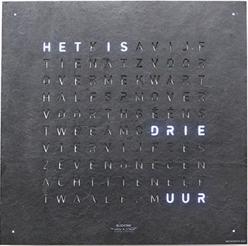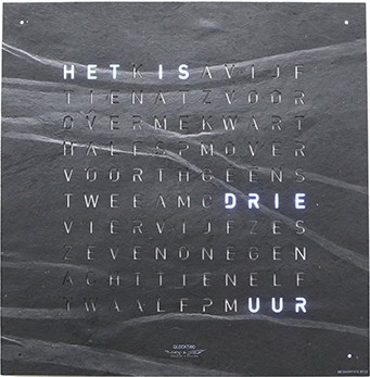 Weergave in verlichte woorden d.m.v. L.E.D. verlichting. De tijd wordt met een interval van 5 minuten op het display veranderd, de tussenliggende minuten worden door de brandende punten op de hoeken weergegeven.Lichtsensor past de lichtintensiteit aan op basis van het beschikbare licht van de omgeving.